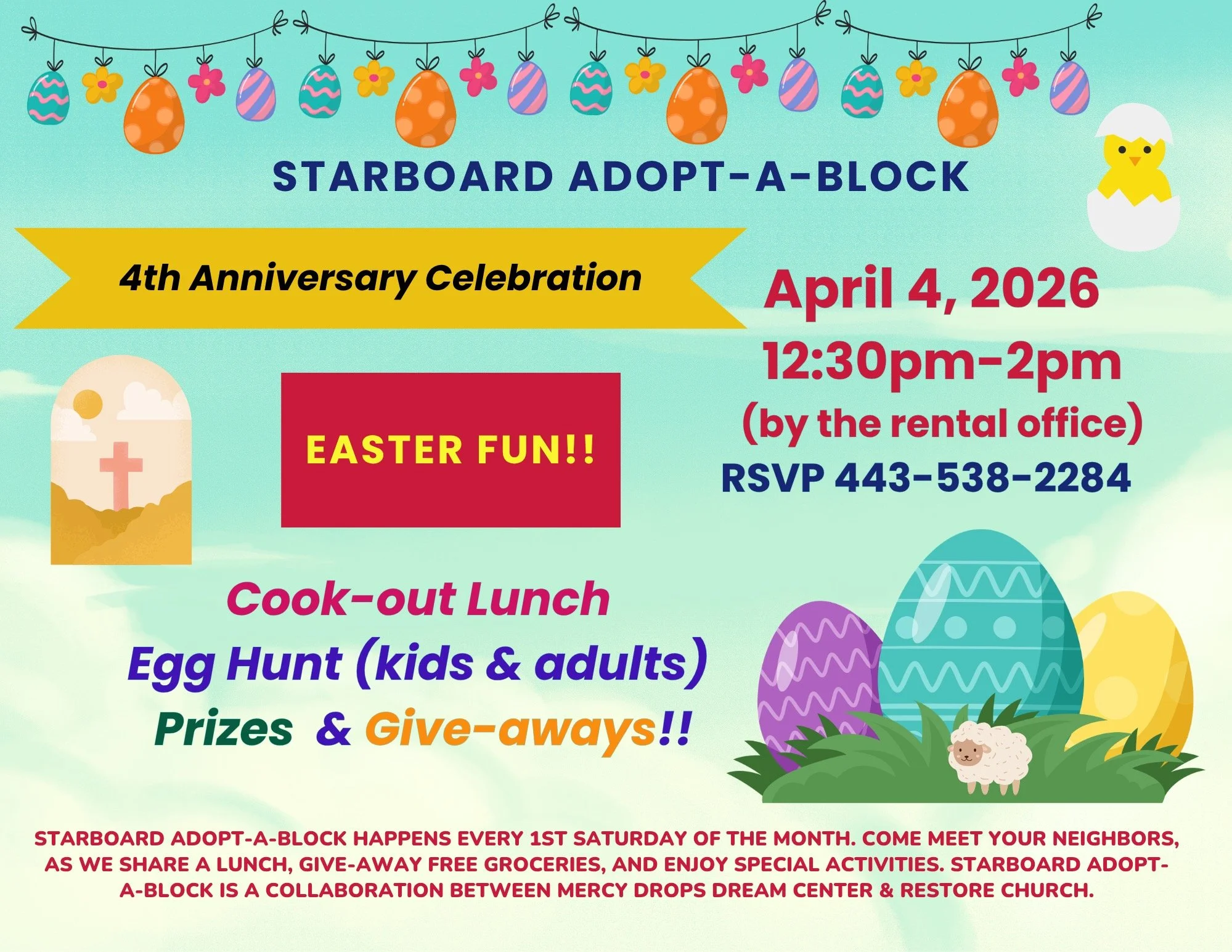 Join us the first Saturday of every month as the Restore Church Outreach Team serves the Starboard Community! Be part of sharing meals, giving away groceries, leading activities, and making a real impact right in our neighborhood.
